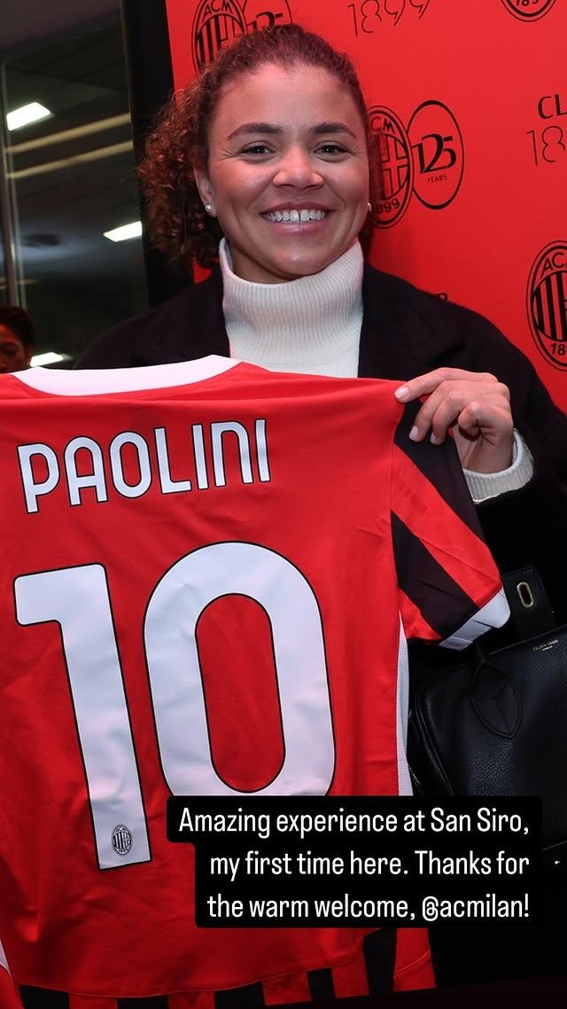 與此同時,保利尼還獲贈一件印有她名字的米蘭10號球衣,她在社媒寫道:“在聖西羅的非凡體驗,這是我第一次來這裏,謝謝米蘭的熱烈歡迎。”