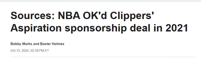 北京時間10月14日,ESPN報道,多位消息人士透露,2021年NBA曾對快船隊與Aspiration公司的一份3億美元讚助協議進行審核並批準。數月後,這家公司與球星萊昂納德簽署了一份單獨協議,該協議引發了聯盟對“工資帽規避”的調查。